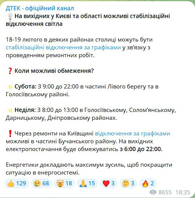 Также Коваленко предупредил, что на выходных в Киеве будут проводить ремонтные работы, поэтому возможны временные отключения в некоторых районах.