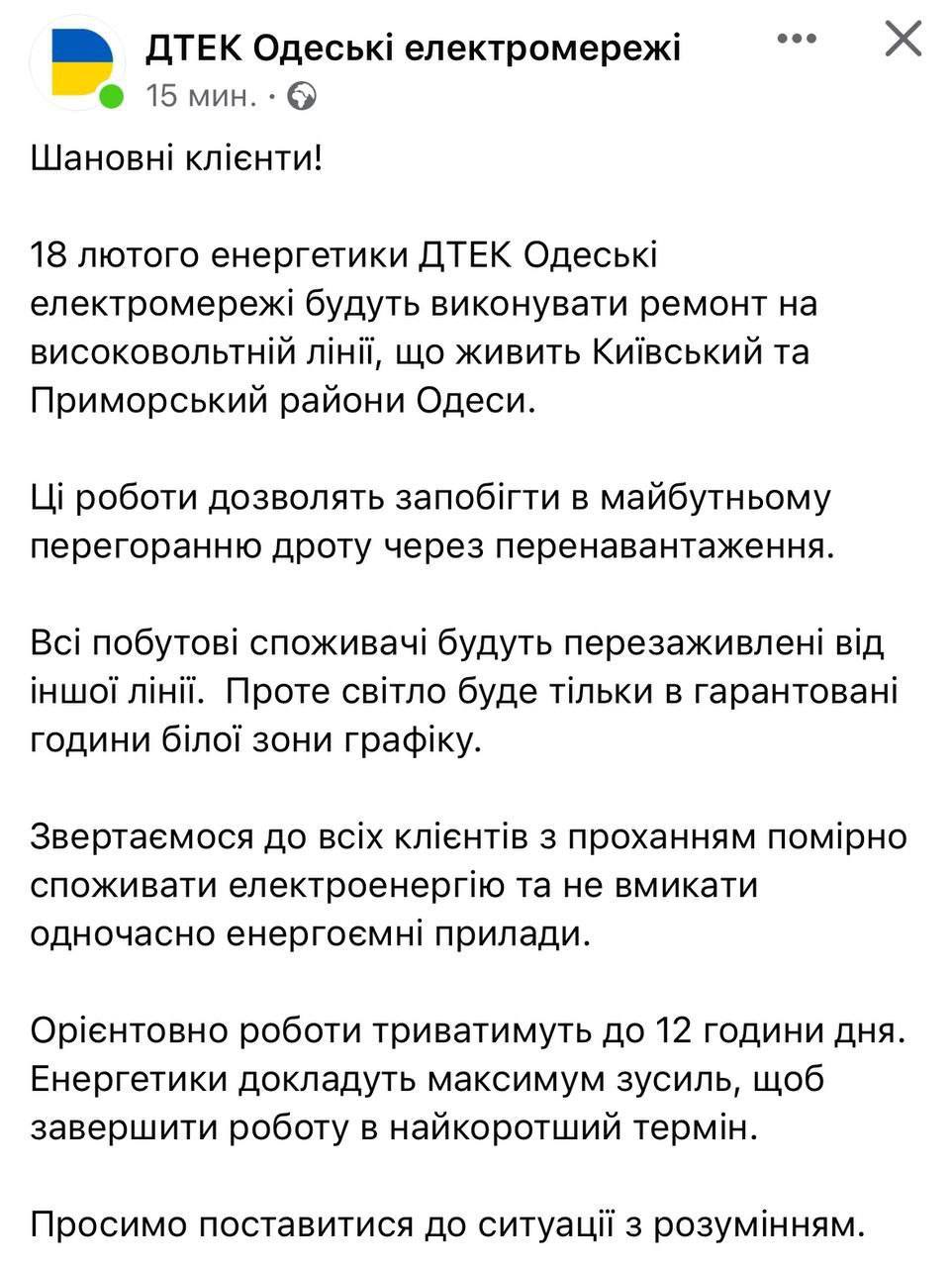 19:58 В двух районах Одессы завтра свет будет только в гарантированные часы, так как местный ДТЭК запланировал ремонт поврежденной высоковольтной линии.