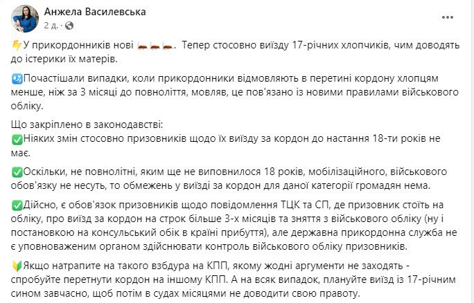 «Если натолкнетесь на такого взбдура на КПП, которому никакие аргументы не заходят – попробуйте пересечь границу на другом КПП. А на всякий случай, планируйте выезд с 17-летним сыном раньше времени, чтобы потом в судах месяцами не доказывать свою правоту», – пишет Василевская.