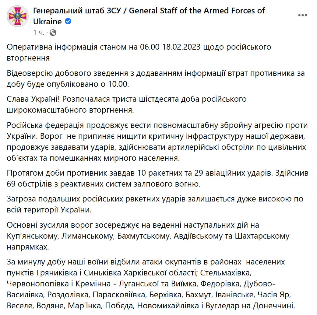 07.26 Сводка украинского Генштаба на утро 18 февраля. Главное: