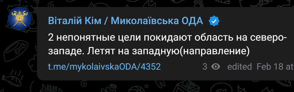 08.42 Две воздушные цели летят через Николаевскую область на запад Украины. Об этом сообщает губернатор региона Виталий Ким, комментируя слухи о пуске российских ракет.