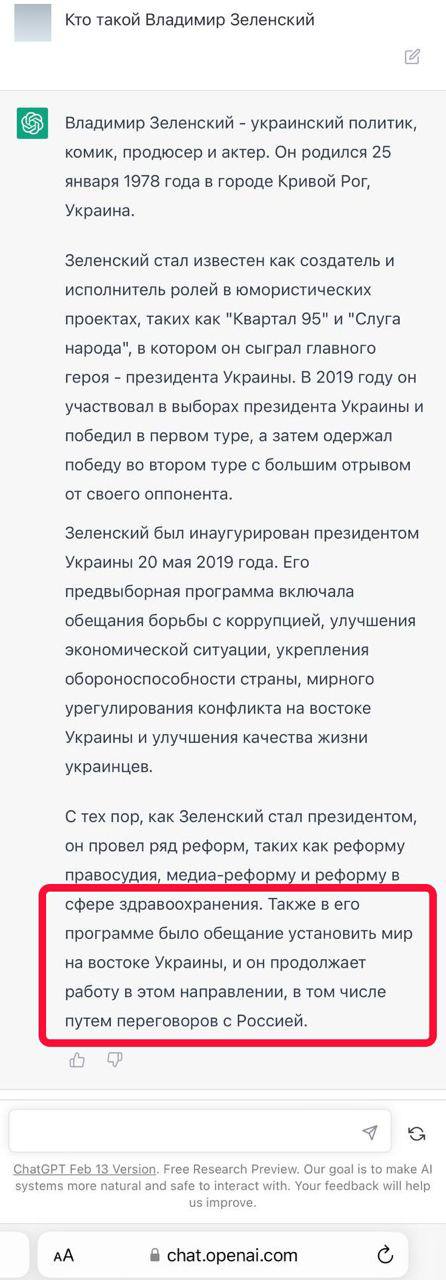 Так, на вопрос кто такой Владимир Зеленский, нейросеть, перечисляя общие сведения из его биографии, заканчивает описание словами о том, что одним из пунктов его предвыборной программы было установление мира на востоке Украины и «он продолжает работу в этом направлении, в том числе, и путём переговоров с Россией».