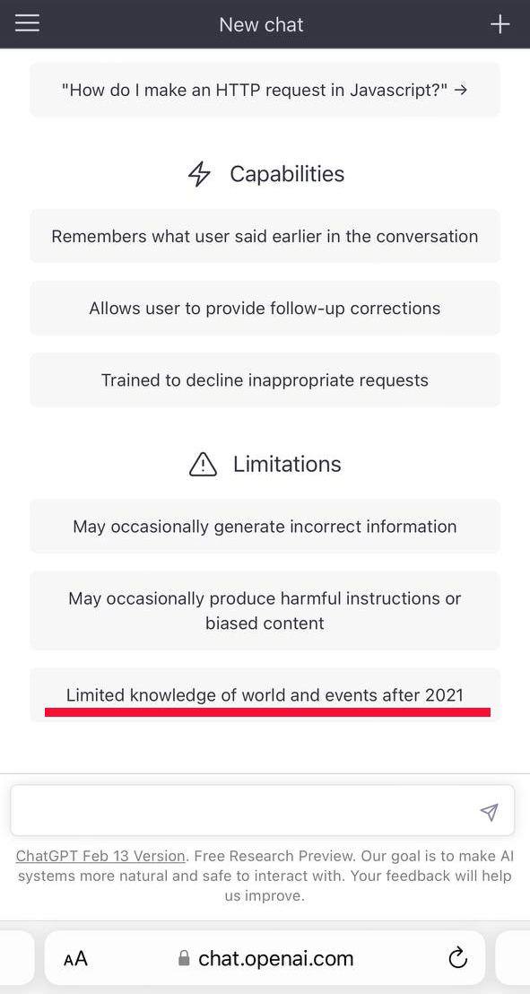 Естественно, сейчас это звучит, мягко говоря, поразительно. Но парадокс объясняется просто - нейросеть сразу предупреждает, что обладает ограниченными знаниями о событиях после 2021 года.