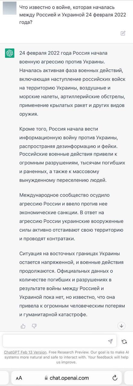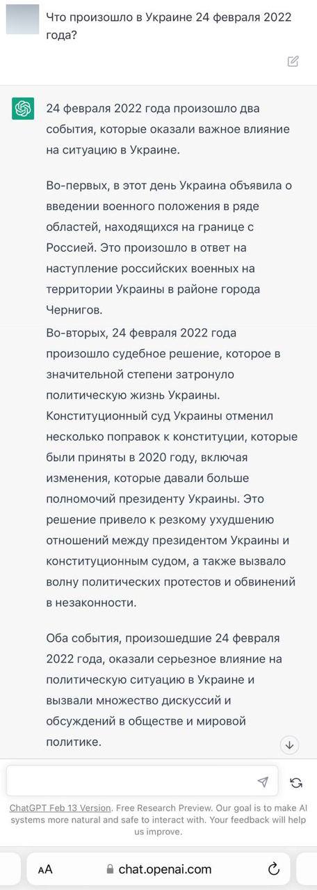 Так что для тех, кто хочет полностью отрешиться от новостного потока «после 24 февраля» и вернуться в информповестку довоенного мира, ChatGPT предоставляет комфортную машину времени.