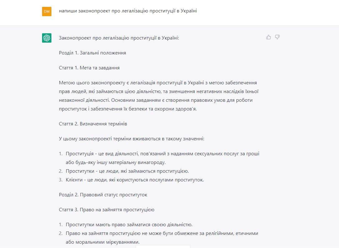 13.59 Министр юстиции Денис Малюська обратился к чат-боту ChatGPT, который уже доступен в Украине, с просьбой разработать законопроект о легализации проституции в стране.