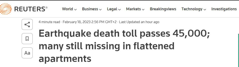 15.58 Число погибших в результате турецко-сирийского землетрясения превысило 45 тысяч человек.