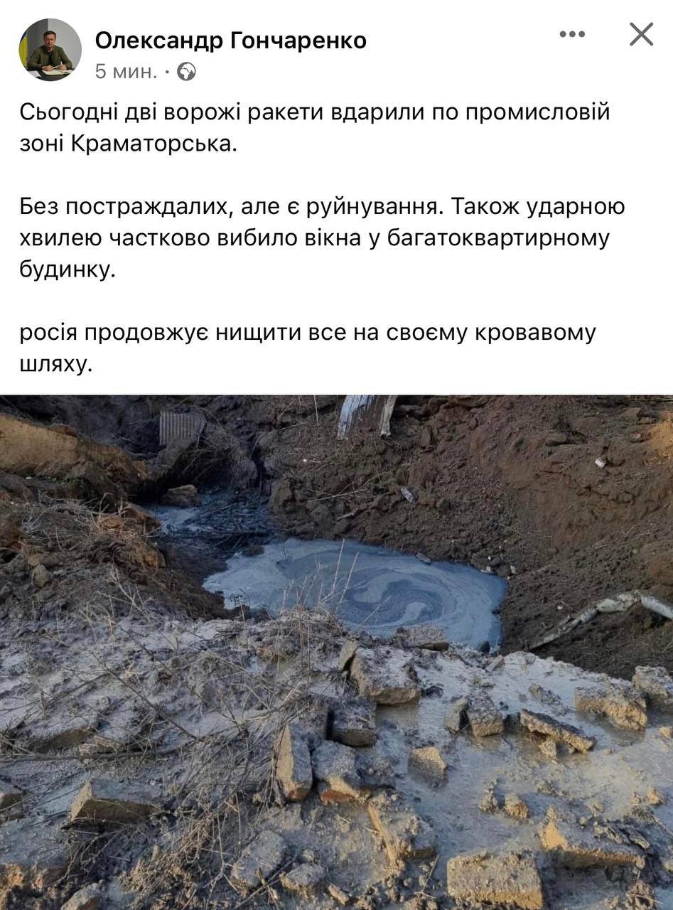 По его словам, две ракеты ударили по промышленной зоне Краматорска. Без пострадавших, но есть повреждения.