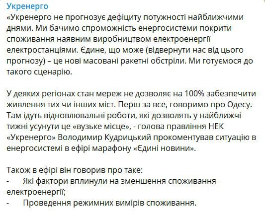 "Укрэнерго" не прогнозирует дефицит мощности в ближайшие дни. Мы видим способность энергосистемы покрыть потребление существующим производством электроэнергии электростанциями. Единственное, что может отвратить нас от этого прогноза – это новые массированные ракетные обстрелы. Мы готовимся к такому сценарию", - сообщил в эфире телемарафона председатель правления НЭК "Укрэнерго" Владимир Кудрицкий.