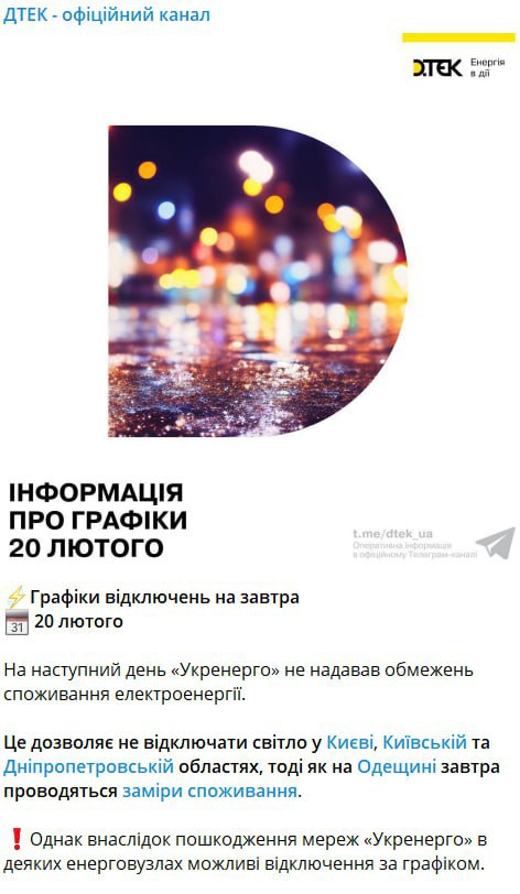 На завтрашний день, 20 февраля, "Укрэнерго" не предоставлял ограничения потребления электроэнергии.