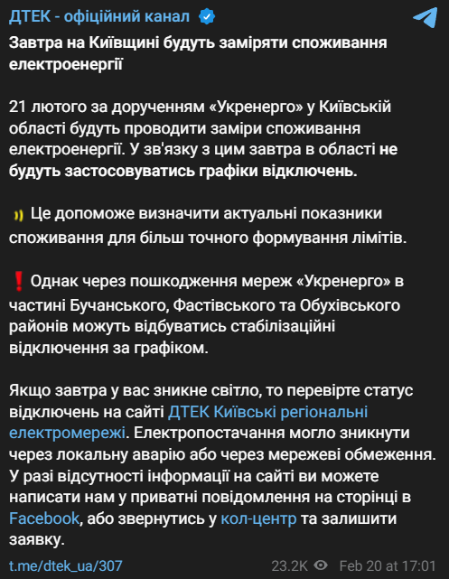 "Если завтра у вас исчез свет, то проверьте статус отключений на сайте ДТЭК Киевские региональные электросети. Электроснабжение могло исчезнуть из-за локальной аварии или из-за сетевых ограничений. В случае отсутствия информации на сайте вы можете написать нам в частные сообщения на странице Facebook или обратиться в колл-центр и оставить заявку", - говорится в сообщении.