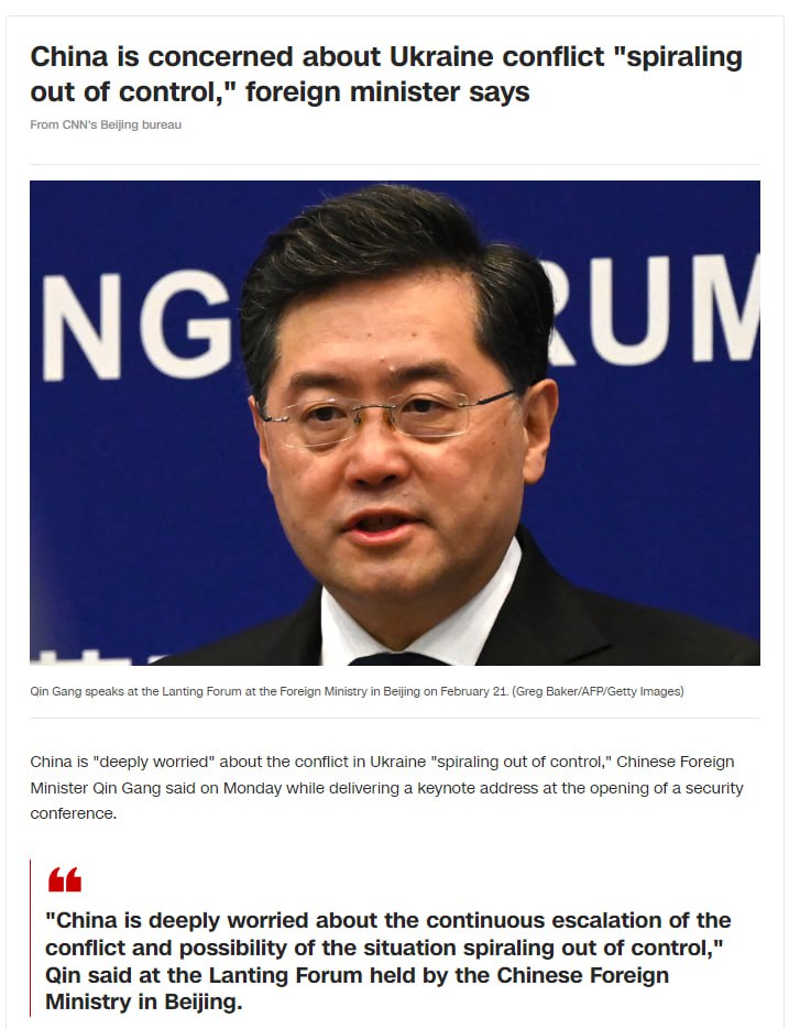 "Китай глубоко обеспокоен продолжающейся эскалацией конфликта и возможностью выхода ситуации из-под контроля. Мы призываем соответствующие страны немедленно прекратить разжигать огонь, обвинять Китай и раздувать риторику "сегодня Украина, завтра Тайвань", - заявил министр иностранных дел Китая Цинь Ган, выступая с программной речью на открытии конференции по безопасности Лантин в Пекине,