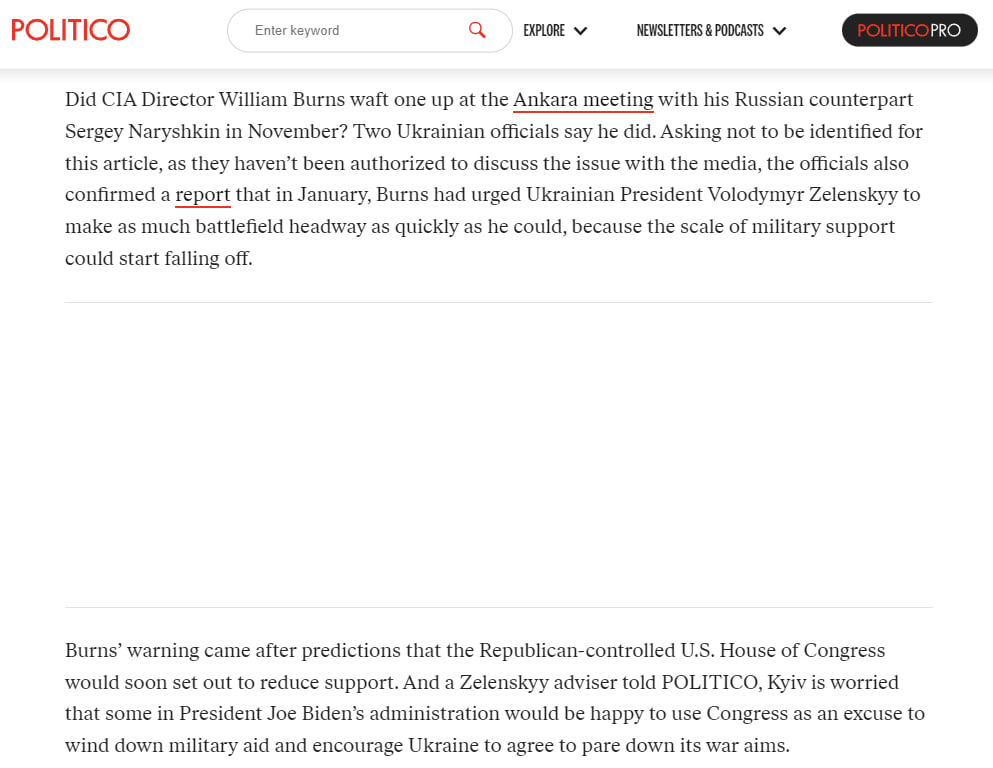 "Предупреждение Бернса прозвучало после прогнозов о том, что Палата Конгресса США, контролируемая республиканцами, вскоре начнет сокращать поддержку. А советник Зеленского сказал Politico, что Киев обеспокоен тем, что некоторые в администрации президента Джо Байдена будут рады использовать Конгресс в качестве предлога для свертывания военной помощи и побудить Украину согласиться на сокращение своих военных целей", - говорится в материале.