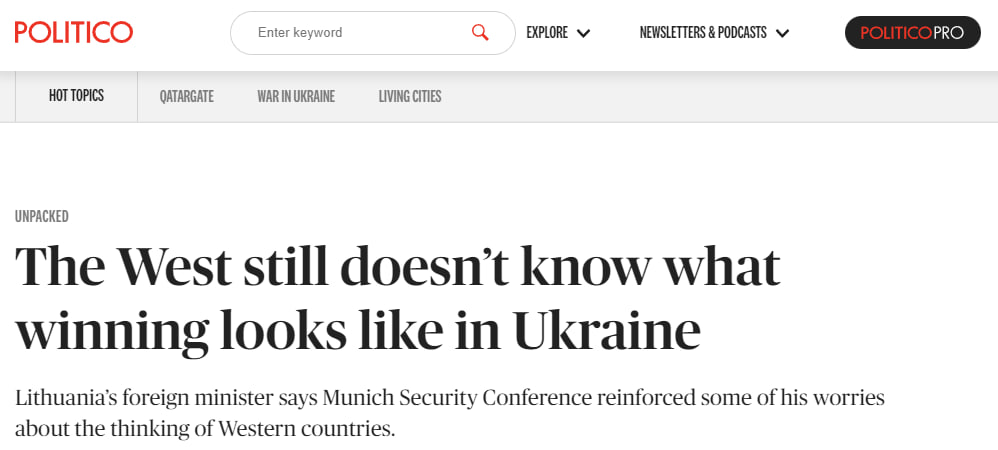 Статья под заголовком "Запад до сих пор не знает, как выглядит победа в Украине" посвящена вопросу конечной цели конфликта.