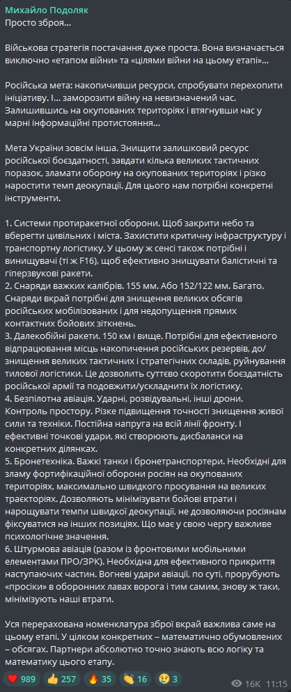 Для этого Украине нужны поставки систем ПРО, снарядов тяжелых калибров, дальнобойных ракет, беспилотников, бронетехники и штурмовой авиации, пишет Подоляк.