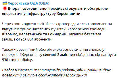 "Из-за ночного обстрела электроснабжение исчезло в пригороде Херсона – в поселке Зимовщик отсоединено от напряжения 538 точек учета. Вскоре энергетики приступят к работе, чтобы как можно быстрее вернуть свет в дома жителей Херсонщины", - говорится в сообщении.