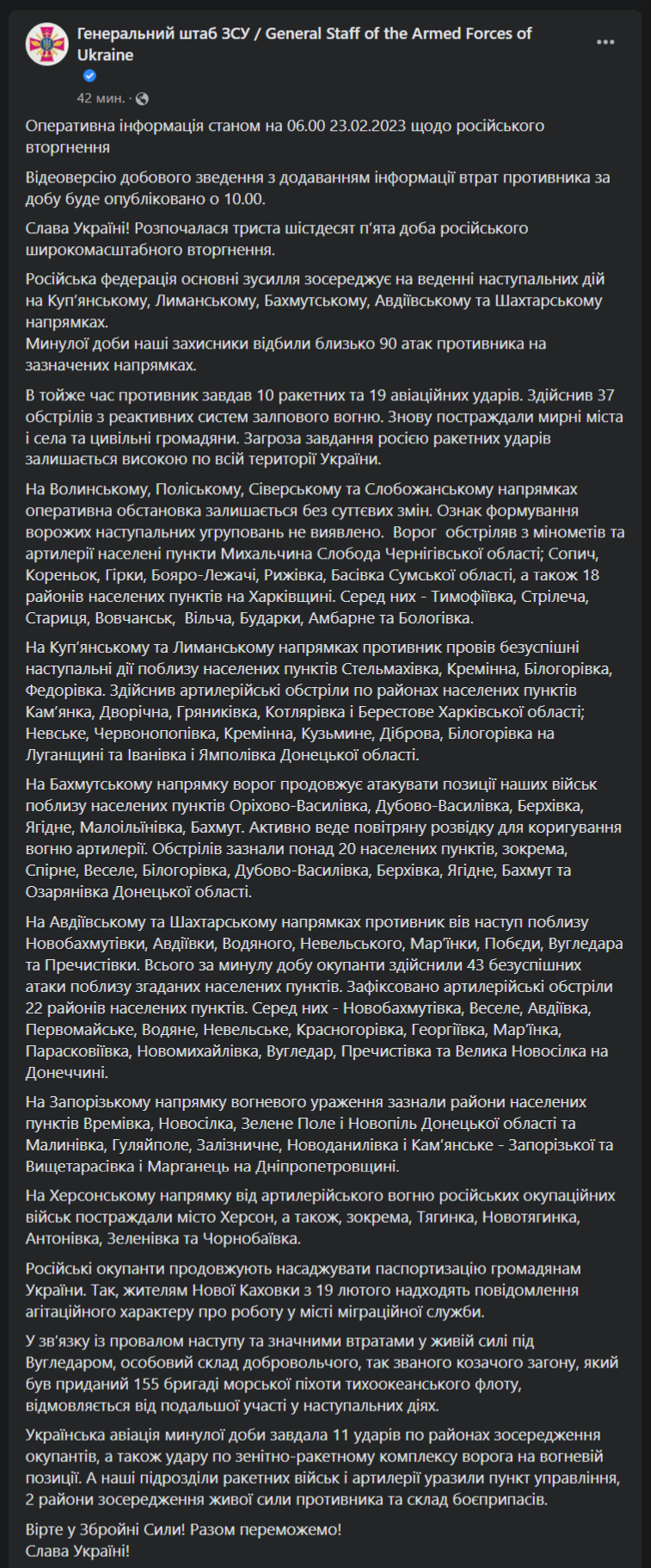 07:50 Главное из сводки Генштаба ВСУ на утро 23 февраля: