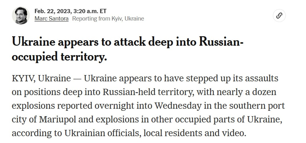 Издание отмечает, что взрывы, прогремевшие в ночь на среду в Мариуполе, свидетельствует о том, что Украина, по-видимому, активизировала свои атаки на позиции в глубине удерживаемой Россией территории. Взрывы прогремели не только в Мариуполе, но и в других захваченных Россией частях Донецкой, Луганской и Херсонской областей Украины, сообщает NYT.