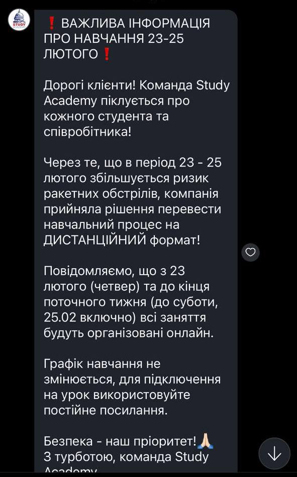 "Из-за того, что в период с 23 по 25 февраля увеличивается риск ракетных обстрелов, компания решила перевести учебный процесс на дистанционный формат".