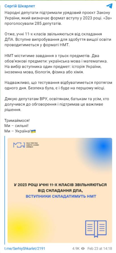"Народные депутаты поддержали правительственный проект закона Украины, определяющий формат вступления в 2023 году. "За" проголосовали 285 депутатов. Итак, учащиеся 11-х классов освобождаются от сдачи ГИА. Вступительные экзамены для получения высшего образования будет проводиться в формате НМТ", - пишет Шкарлет.