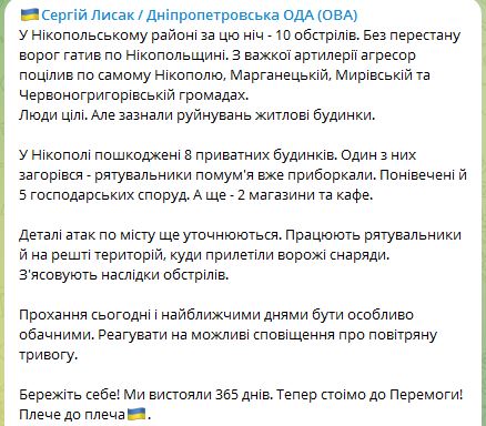 Из тяжелой артиллерии агрессор попал по самому Никополю, по Марганецкой, Мировской и Красногригорьевской громадам. Обошлось без жертв, но разрушены жилые дома.
