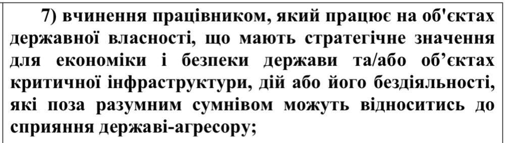 В частности, основанием для увольнения работников объектов государственной собственности, имеющих стратегическое значение для экономики и безопасности государства и/или объектов критической инфраструктуры, будут считаться действия лица, которые "вне всякого сомнения могут относиться к содействию государству-агрессору".