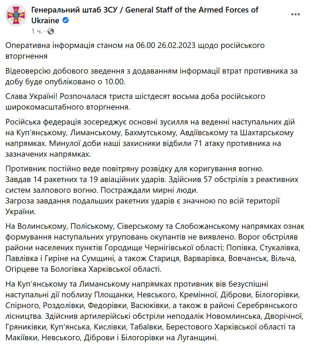 В воскресенье, 26 февраля, Генштаб Вооруженных сил Украины опубликовал утреннюю сводку с фронта.