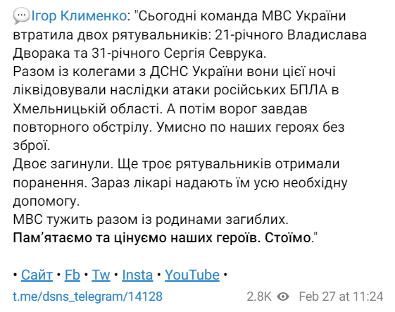 Число погибших из-за ночной атаки на Хмельницкий увеличилось. В больнице умер второй спасатель