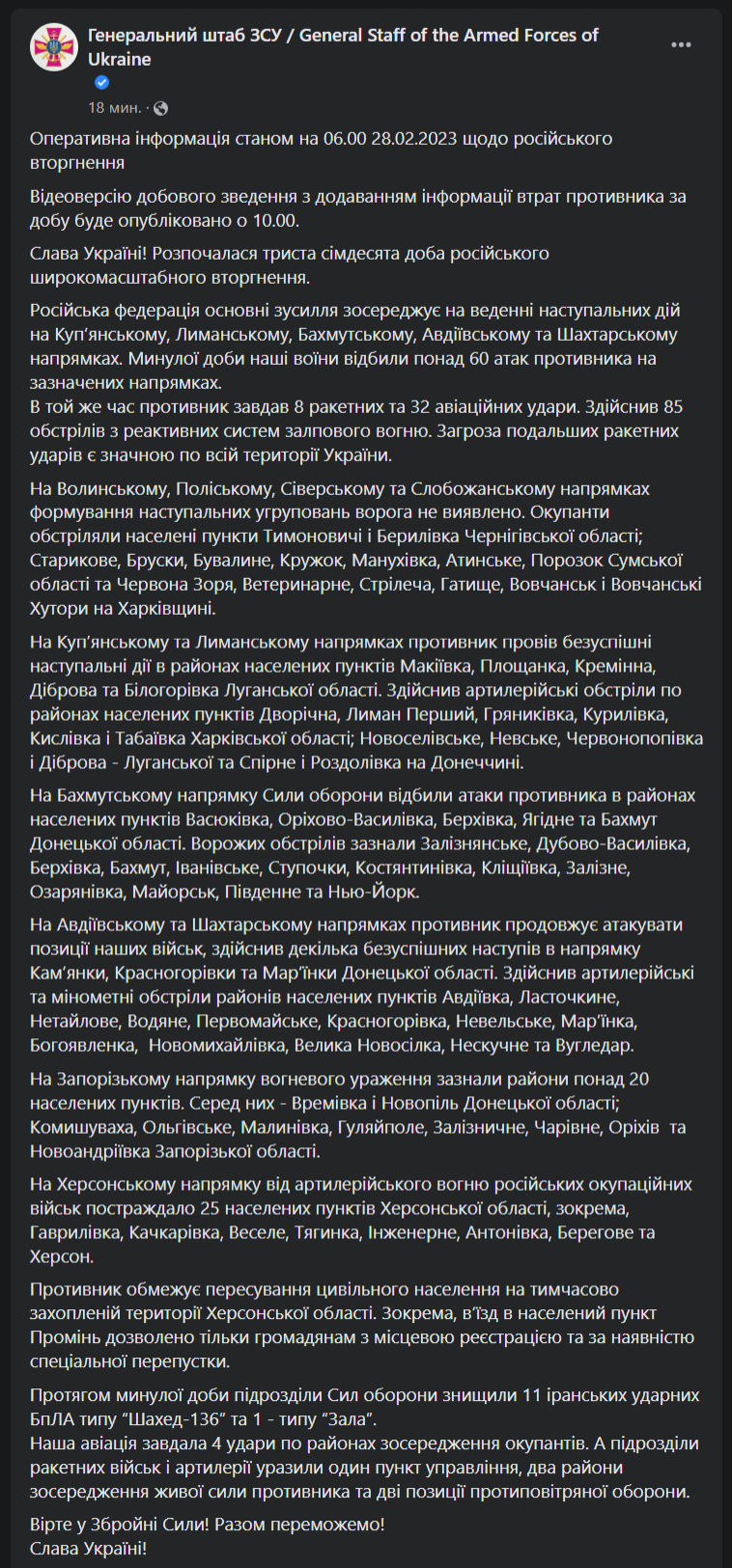 06:55 Сводка украинского Генштаба на утро 28 февраля.