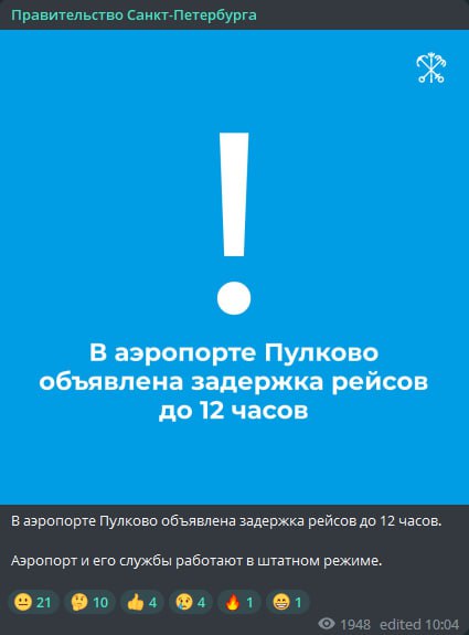 10:19 Петербургский аэропорт "Пулково" временно не принимает самолеты, сообщается в официальном Telegram-канале правительства города.