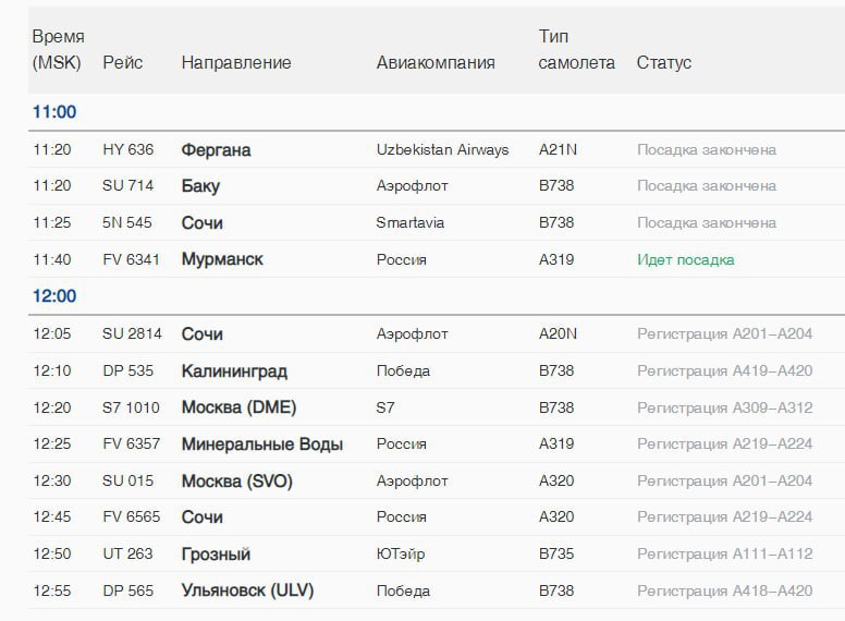 Тем временем согласно онлайн-табло "Пулково", регистрация пассажиров на вылетающие рейсы продолжается, у некоторых статус "посадка закончена"