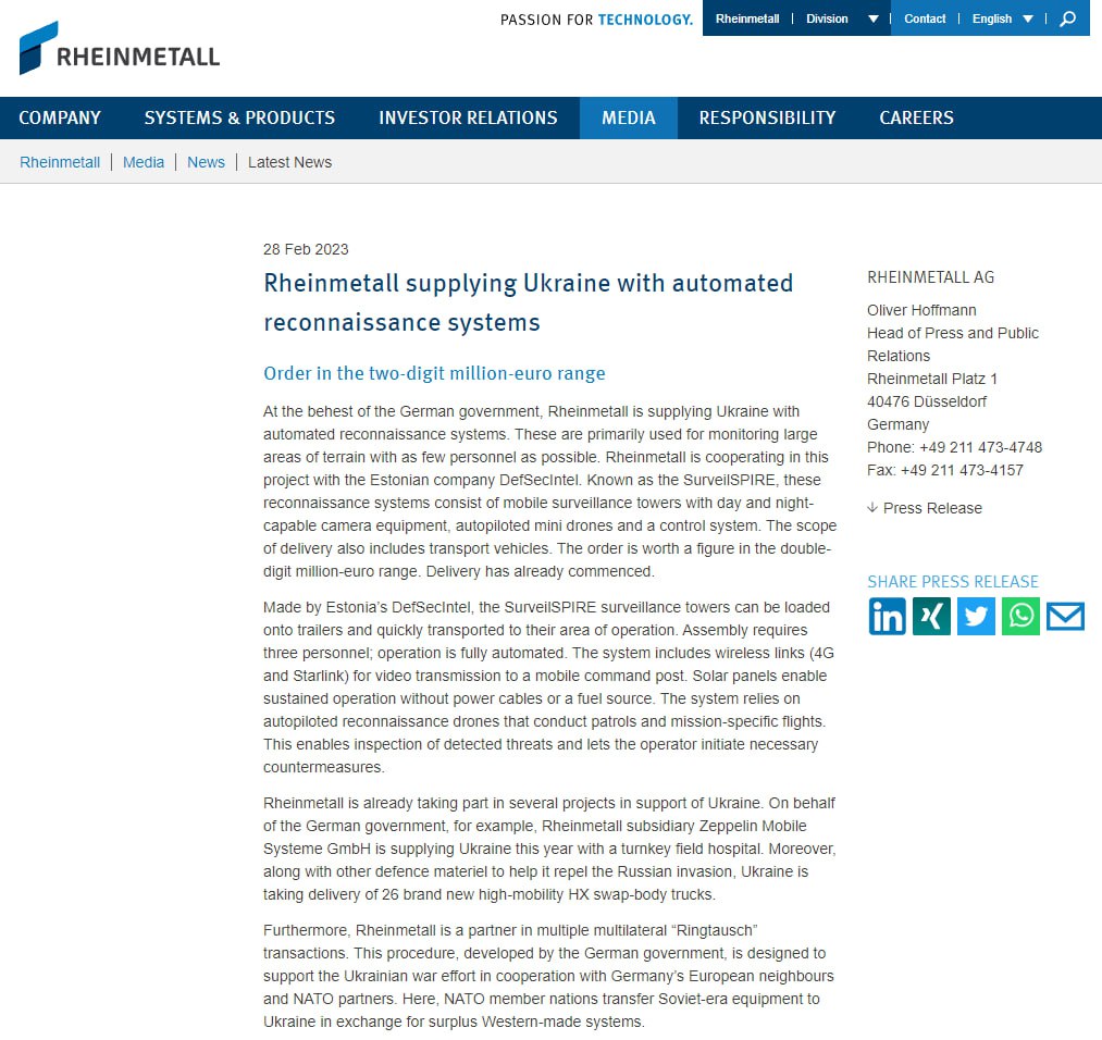 13.10 Немецкий оборонный концерн Rheinmetall начал поставлять в Украину автоматизированные разведывательные системы, говорится в заявлении компании.