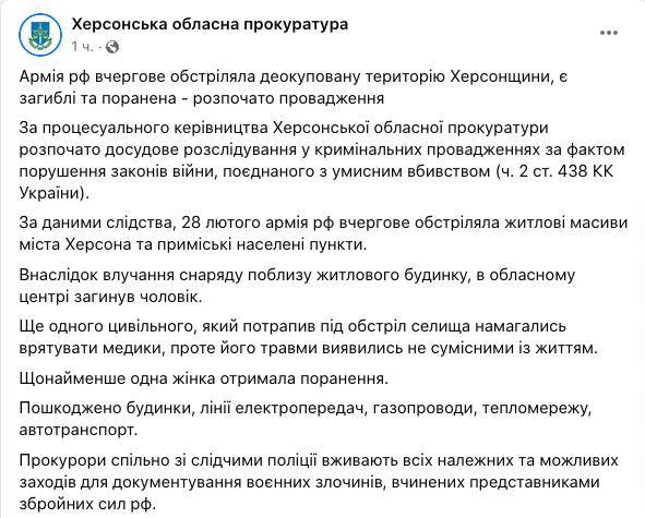 11.25 Россияне обстреляли Херсон, сообщили в Офисе президента.