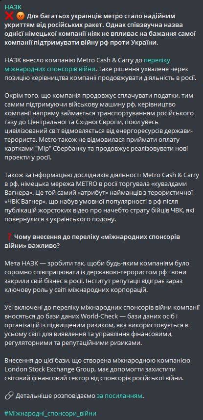 НАПК внесло "Metro" в список международных спонсоров войны