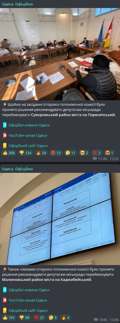 Сегодня топонимическая комиссия рекомендовала переименовать Суворовский район в Пересыпский (среди вариантов были Лиманский и Николаевский), а Малиновский -  в Хаджибейский.