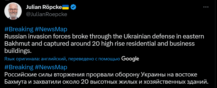 Журналист Bild Юлиан Рёпке сообщил, что противник продвинулся в восточной части Бахмута.