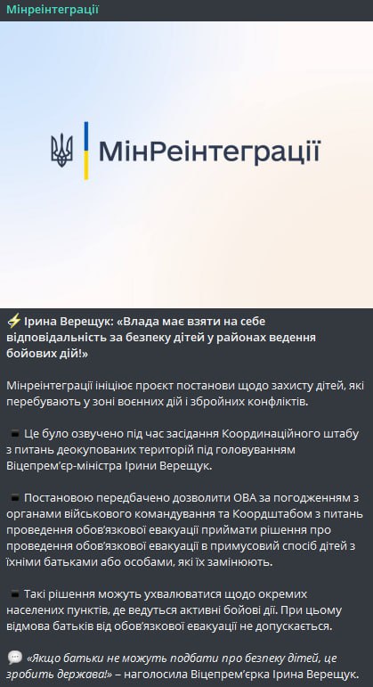 "Постановлением предусмотрено разрешить ОВА по согласованию с органами военного командования и Коордштабом по вопросам проведения обязательной эвакуации принимать решение о проведении обязательной эвакуации принудительным способом детей с их родителями или лицами, которые их заменяют", - сообщает пресс-служба Минреинтеграции.