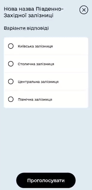Теперь украинцы могут через "Дию" выбрать новое название. Предложены 4 варианта для голосования - Киевская, Столичная, Центральная или Северная железная дорога.