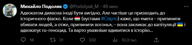 "Быть адвокатом дьявола иногда выгодно, но чаще это приводит к историческому фиаско. Когда Венгрия (устами Сийярто) говорит, что "цель состоит в том, чтобы прекратить убивать людей, а значит прекратить огонь", он призывает к капитуляции Украины и выступает за геноцид. Стоит изучить историю внимательнее", - написал Подоляк.