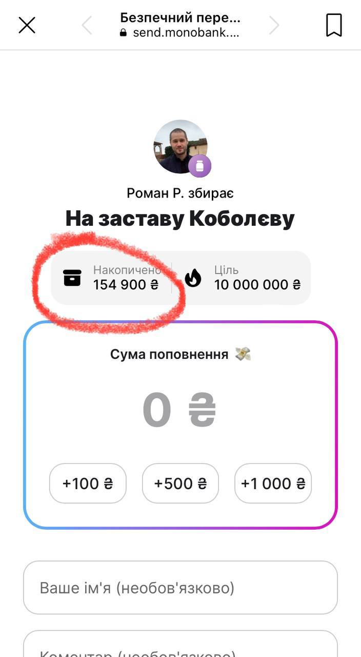 Друзья и родные Коболева объявили сразу несколько сборов средств на залог: физические лица могут донатить на карту Монобанка, для более крупных сумм принимаются оплаты на расчетный счет по реквизитам, а также на криптосчет.