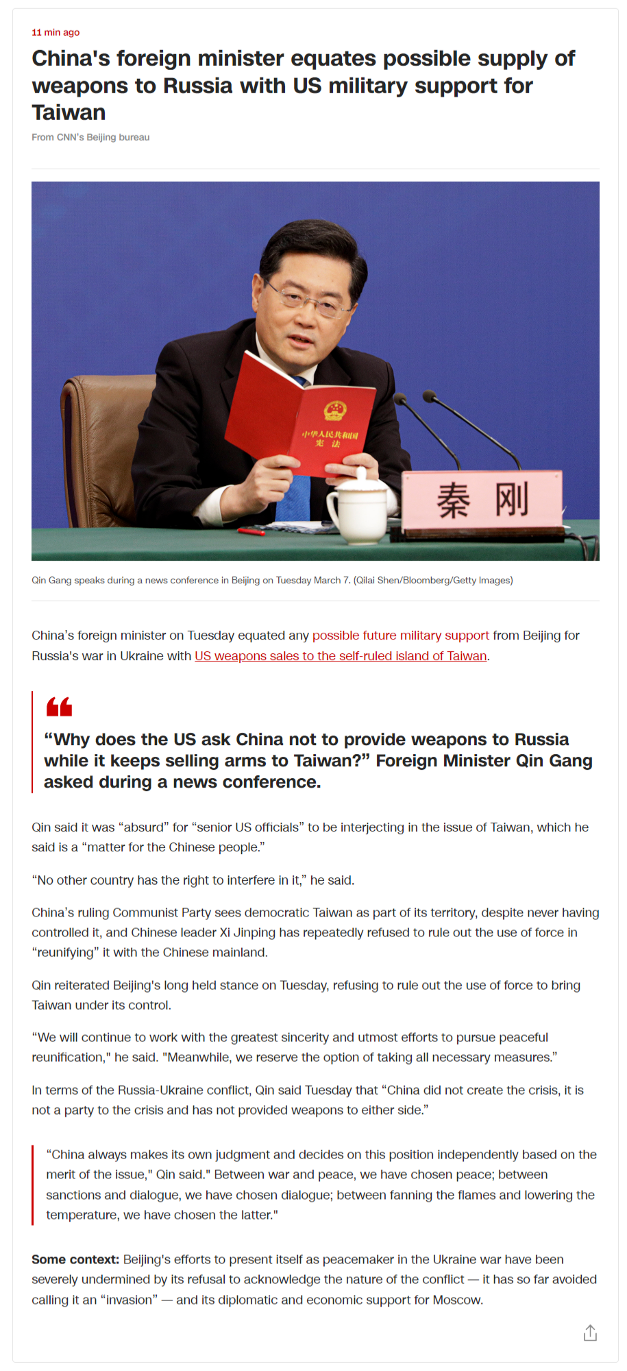 "Почему США просят Китай не поставлять оружие России, в то время как они продолжают продавать оружие Тайваню?" — спросил министр иностранных дел Цин Ган во время пресс-конференции.