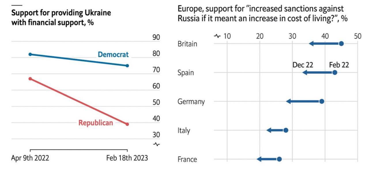 Также снизилась поддержка введения санкций в странах ЕС. В феврале 2022 года в Великобритании за это высказывалось 45% респондентов, в декабре - 35%. Аналогичное снижение произошло во Франции (примерно с 25% до 20%), Германии (с почти 40% - ниже 30%), Италии и Испании.