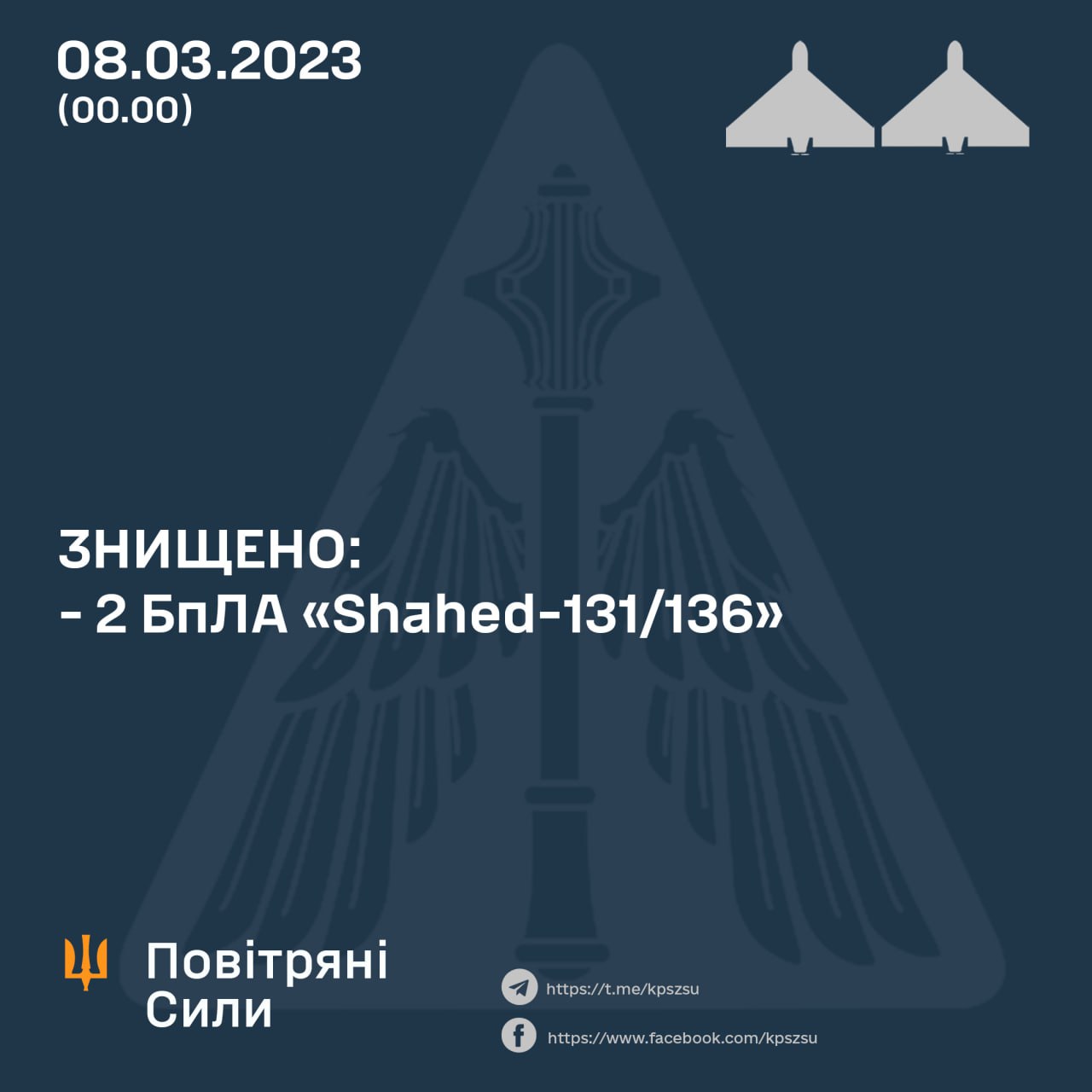 11.01 В полночь силы ПВО сбили два иранских дрона-камикадзе Shahed-131/136, которыми противник атаковал Украину с севера, сообщают Воздушные силы ВСУ.