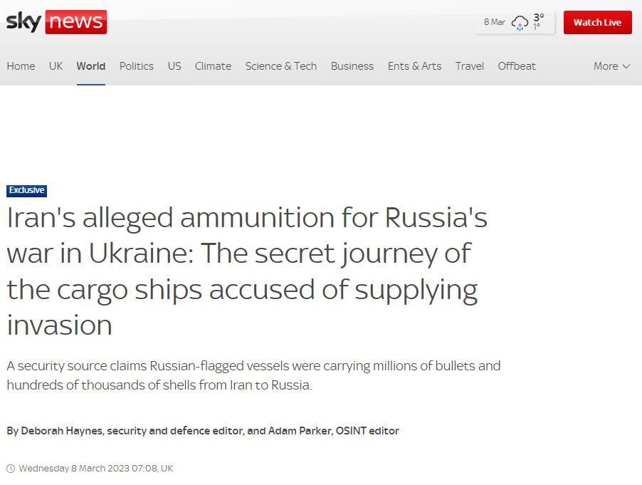 Источник сообщил журналистам, что в январе из иранского порта в Россию через Каспийское море вышли два грузовых корабля под российским флагом, на борту которых находилось около 100 миллионов пуль и около 300 тысяч снарядов.