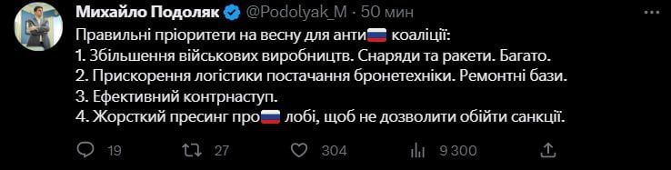 13.45 Советник главы ОП Подоляк перечисляет "правильные приоритеты на весну для антироссийской коалиции":