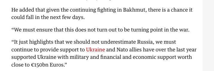 14:39 Генсек НАТО допустил падение Бахмута "в ближайшие дни", пишет The Guardian.