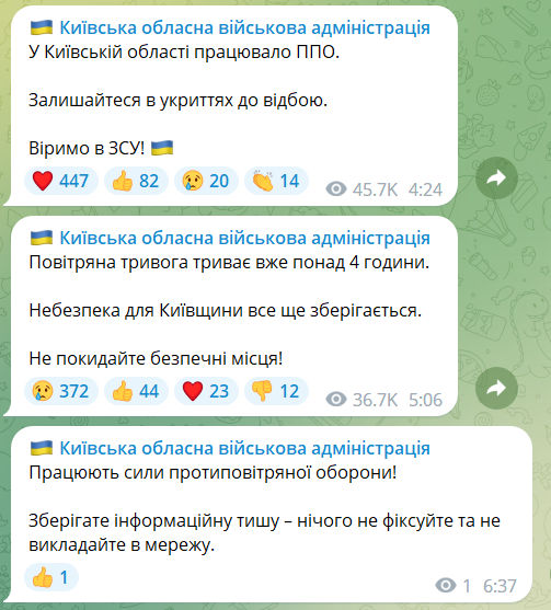 Между тем, Киевская областная военная администрация сообщает о работе в регионе сил ПВО. Противовоздушная оборона работала около 04:30. Также о работе ПВО сообщается около 06:30.