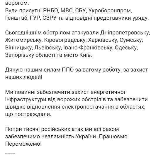 "Мы должны обеспечить защиту энергетической инфраструктуры от вражеских обстрелов и обеспечить быстрое восстановление электроснабжения в пострадавших областях", - заявил президент.