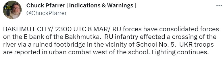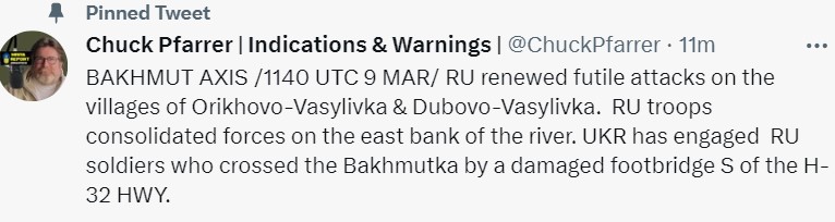 Позже он опубликовал еще одну карту и прокомментировал ее. По словам Пфаррера, "РФ возобновила безрезультатные атаки на села Орехово-Васильевка и Дубово-Васильевка". Также, добавил он, войска России сосредоточили свои силы на восточном берегу реки. ВСУ вступили в бой с российскими солдатами, которые пересекли Бахмутку по поврежденному пешеходному мосту автострады Н-32, пишет обозреватель.
