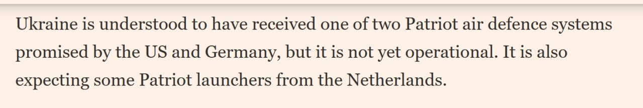 08.45 Украина получила одну из двух систем ПВО Patriot, обещанных США и Германией. Об этом пишет газета Financial Times.