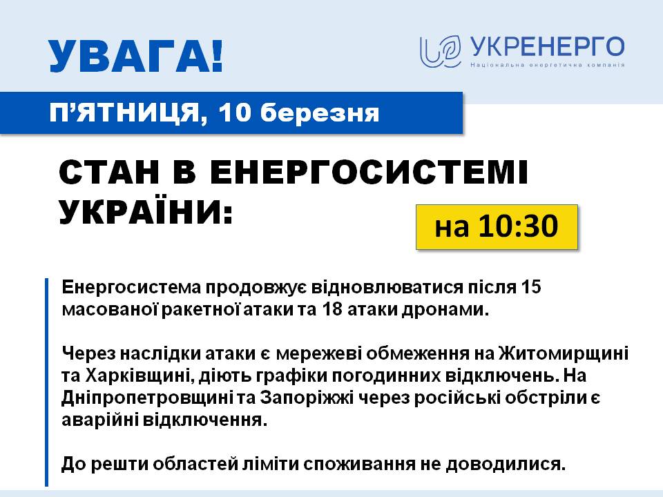 10.45 В Житомире и Харькове часть потребителей по-прежнему остаются без электроснабжения после вчерашней ракетной атаки, сообщает "Укрэнерго".